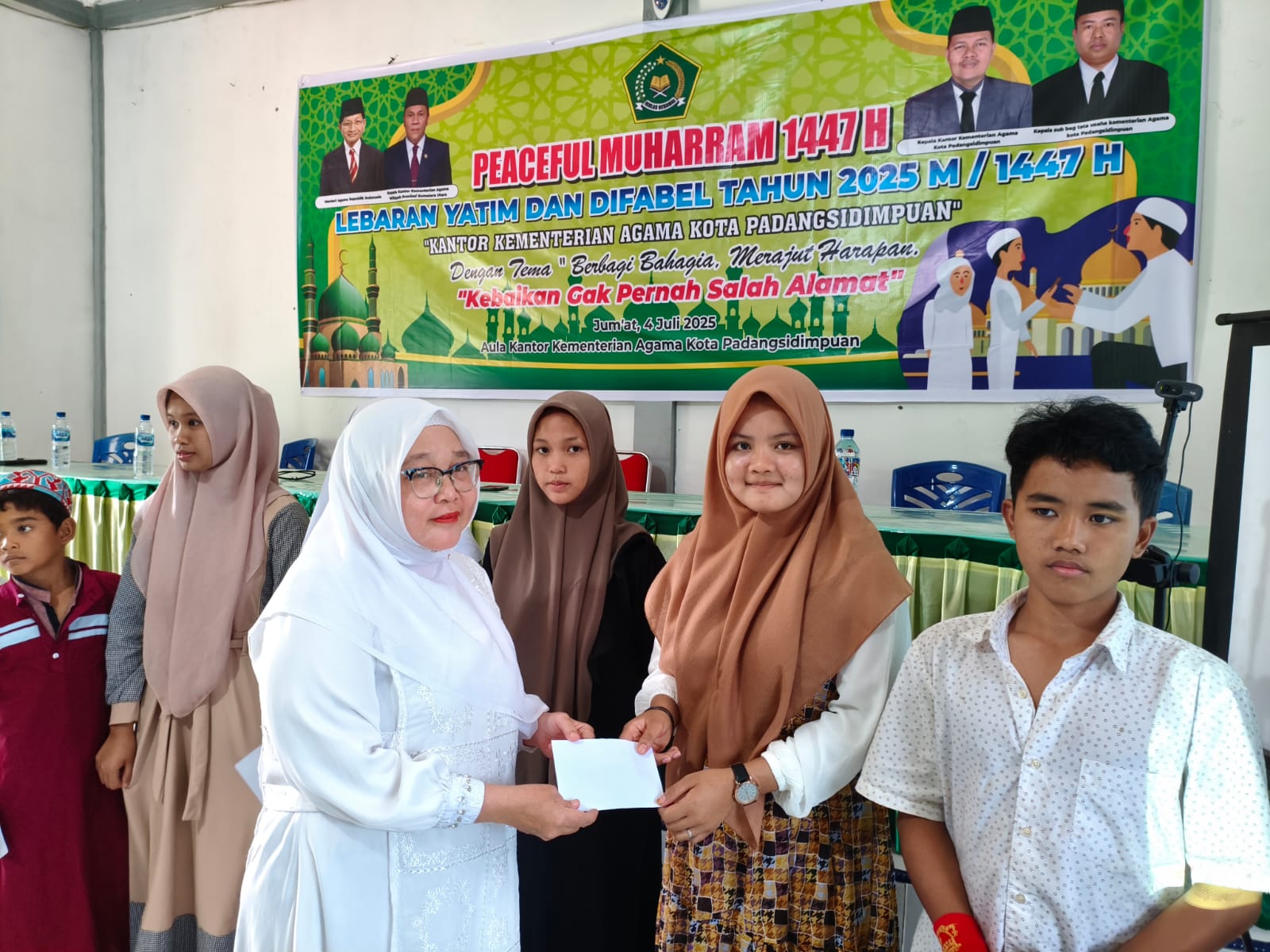 Padangsidimpuan (Humas). Kepala MTsN 1 Padangsidimpuan Hj. Asriana, M. Ag turut hadir dalam kegiatan sosial bertajuk “Lebaran Yatim dan Disabilitas” yang diselenggarakan oleh Kantor Kementerian Agama Kota Padangsidimpuan. Kegiatan ini merupakan bagian dari rangkaian peringatan Peaceful Muharram 1447 H.