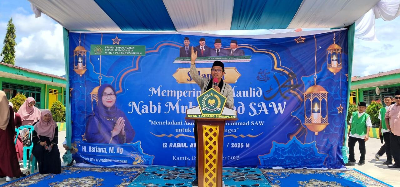 MTs Negeri 1 Padangsidimpuan turut menyemarakkan momen penuh berkah ini dengan mengadakan Peringatan Maulid Nabi Muhammad SAW 1447 H, bertempat di lapangan utama madrasah (18/09). Acara ini dihadiri oleh Kepala Tata Usaha Kantor Kementerian Agama Kota Padangsidimpuan, kepala madrasah, komite madrasah, pengawas madrasah, tamu undangan : Ka MAN 2 Padangsidimpuan, WKM MAN 1 Padangsidimpuan, tenaga pendidik dan kependidikan, serta seluruh siswa-siswi MTsN 1 Padangsidimpuan. Hadir pula Ust. H. M. Asroi, M.A. sebagai penceramah.