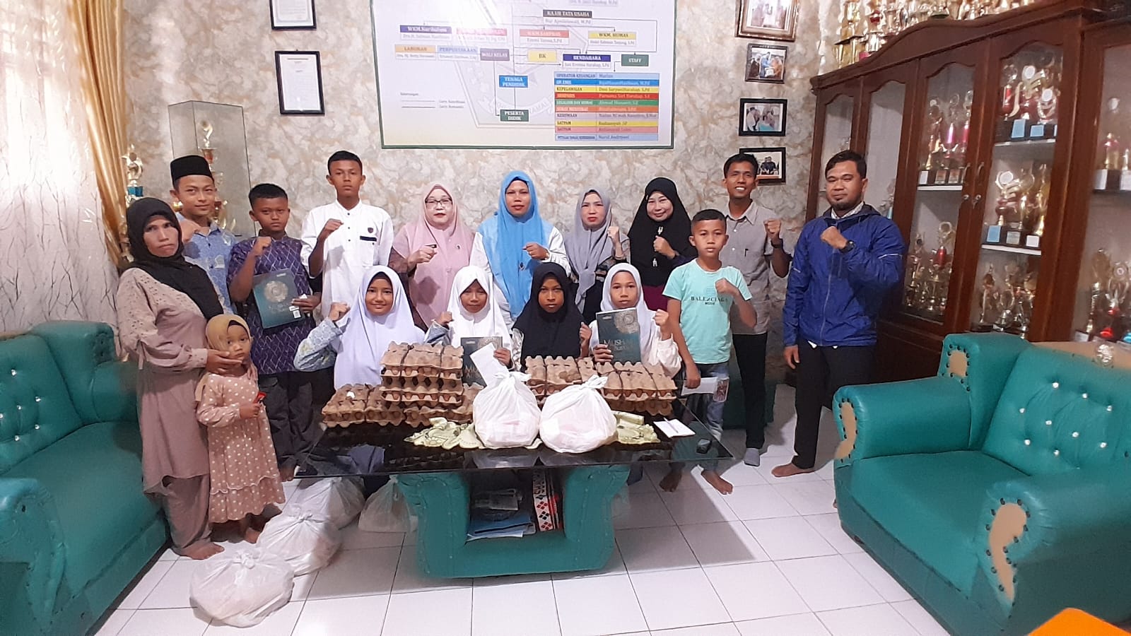 Kepala MTsN 1 Padangsidimpuan, Hj. Asriana, M.Ag bersama KTU, para WKM dan pembina Osim menyerahkan langsung bantuan donasi korban banjir bandang dan tanah longsor yang melanda warga Kota Padangsidimpuan khususnya kepada peserta didik madrasah sebanyak 8 penerima.