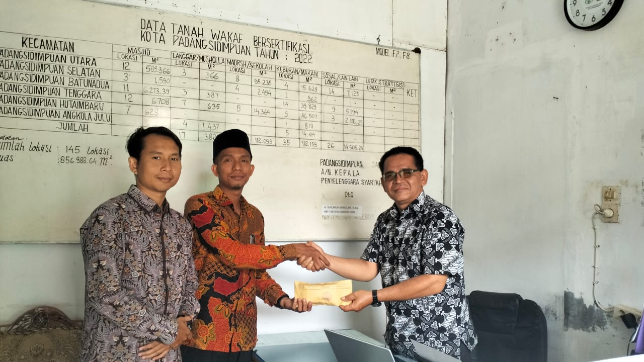 Padangsidimpuan (Humas). Wakil Kepala Bidang Humas, Abdul Rahman Tanjung, S.Pd.,Gr didampingi Ustadz Barani Harahap, S.Pd (Guru PAI) menyerahkan bantuan donasi korban banjir bandang dan tanah longsor yang melanda warga Kota Padangsidimpuan kepada Kepala Seksi Penyelenggara Zakat dan Wakaf Kantor Kementerian Agama Kota Padangsidimpuan, H. Salman Siregar, S.Ag yang diwakili Samsul Anwar Lubis, S.H (Pelaksana Zakat Wakaf) sebesar 1.752.000,-. Donasi atau sumbangan ini nantinya diteruskan ke Badan Amil Zakat dan diberikan kepada saudara kita yang terdampak bencana alam. (20/03/2025)